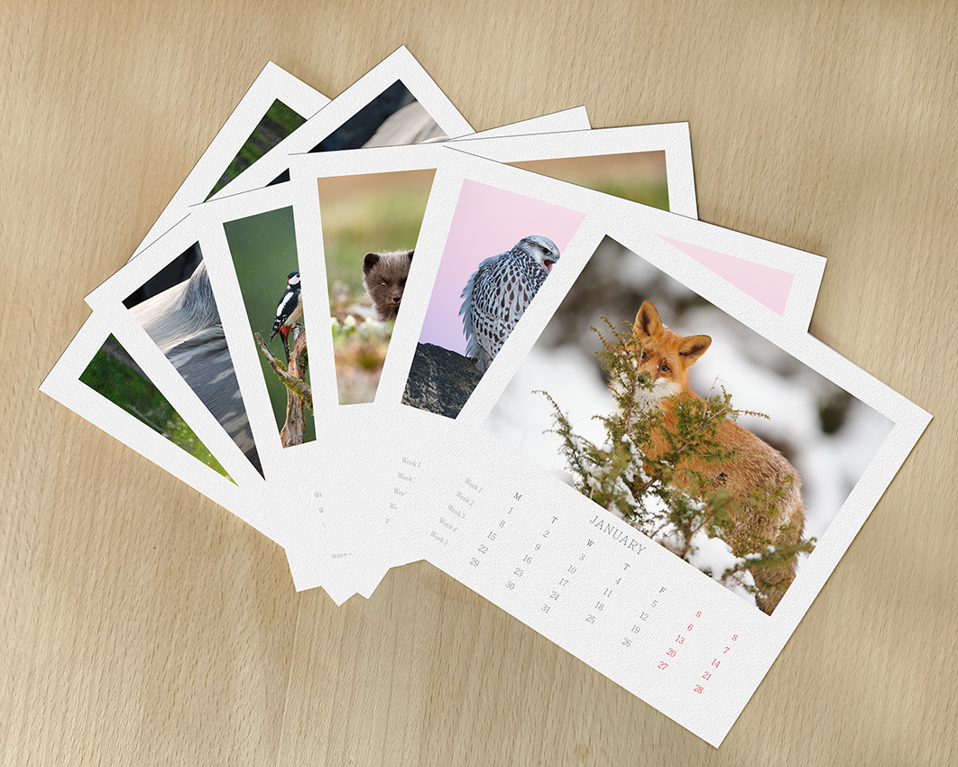 The large wall calendar presents a beautiful collection of wildlife photographs and stunning landscapes. It measures 33 x 44,5 cm or 13 x 17.5 Inches.
